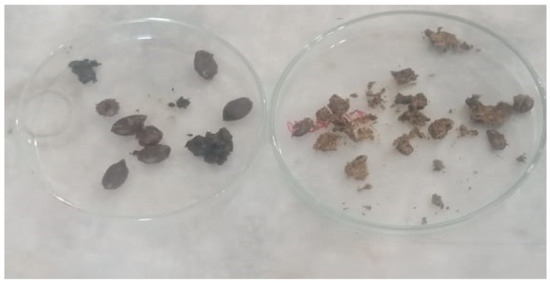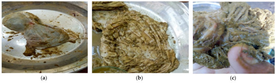 Abomasum content, as shown in Figure 1a–c, was collected from slaughtered goats and sheep at a slaughterhouse in Kohat, Pakistan. A total of 50 samples of the abomasum and 50 samples of feces were taken from goats and sheep, and the samples were brought to Microbiology Laboratory for further processing.