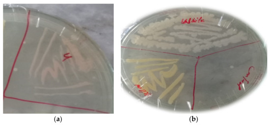 The colony morphology of the bacterial isolates are shown in Table 3. The colonial morphology of the ABP bacterial isolate (Figure 3a appeared as irregular with an entire margin, and its elevation was flat and pinkish in color. Similarly, the colony morphology of ABY bacterial isolate was regular with a filamentous margin, and its elevation was flat and yellow. The colony morphology of the ABCW isolate was irregular in shape and creamy white, as shown in Figure 3b.