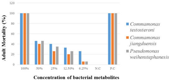 This study has extended the findings by showing that the tested bacteria species are effective against all stages of the nematode parasite. The metabolites of bacterial species C. testosteroni and C. jiangduensis showed a greater effect than filtrates, obtained from P. weihenstephanesis. Similarly, C. jiangduensis and C. testosteroni showed a higher mortality rate of L3 and adult nematodes as compared to P. weihenstephanesis. However, all the bacteria isolates showed a similar impact on eggs hatch inhibition. The positive control in all cases showed the maximum larva mortality, while the negative control exhibited no nematocidal activity at all. It was concluded that the larval and adult nematode mortality, as well as the nematode egg hatch inhibition, have a positive correlation with the doses or concentration of the metabolites, extracted from the bacterial isolates.