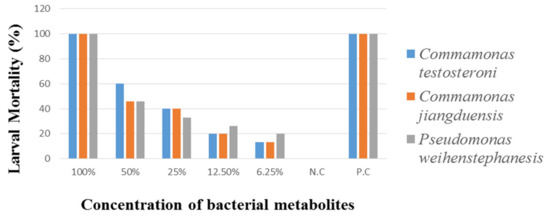 Comamonas jiangduensis showed 100% larval mortality at 100% bacterial metabolite concentration; at a 50% concentration the mortality was recorded as 46%, while the lowest dose (6.25%) of metabolite concentration caused the lowest (13%) mortality of L3 larvae. Analysis of the data showed that P. weihenstephanesis with 100% metabolite concentration caused 100% mortality of H. contortus’ L3 larvae, which was followed by a 46% mortality rate, where 50% bacterial metabolite concentration was used. The lowest concentration of P. weihenstephanesis showed the lowest L3 mortality (20%), as in the case with the other bacterial isolates. The 100% concentration of all the bacterial isolates and the positive control showed the maximum L3 larva mortality, while the negative control showed no activity at all.