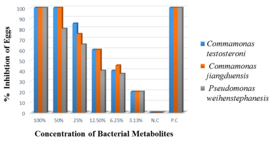 Egg hatch inhibition assay was performed to evaluate the inhibitory effect of the metabolites of the bacterial isolates ABP, ABY, and ABCW. This assay was repeated in triplicate following the protocol given by Coles et al. [33].
