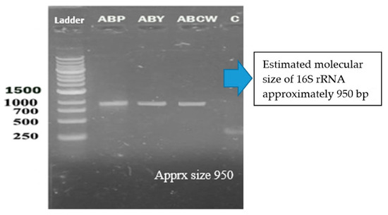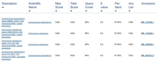 16S rRNA genes verified the bacterial isolates, and each gene fragment was effectively amplified and sequenced by a polymerase chain reaction from their DNA. On the gel, isolated groups of molecular DNA were noted for separate bacterial isolates. The recognized protein marker below 1 kb size was compared for molecular weight. The pattern of the band, found on agarose gel, revealed that the bacterial isolates ABP, ABY, and ABCW were nearly comparable and about 1000 bp of molecular weight, as shown in the Figure 7. The nucleotide sequences of three isolates were compared with the sequences of nearly linked isolates of 16S rRNA genes. The result revealed that ABP bacterial isolate showed resemblance to Comamonas testosteroni was provided by the server and ABY bacterial isolate showed resemblance to Comamonas jiangduensis, while ABCW bacterial isolate showed resemblance to Pseudomonas weihenstephanesis as provided by the server (Figure 7 and Table 7).