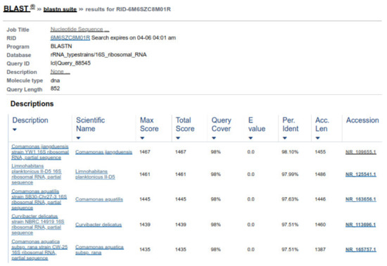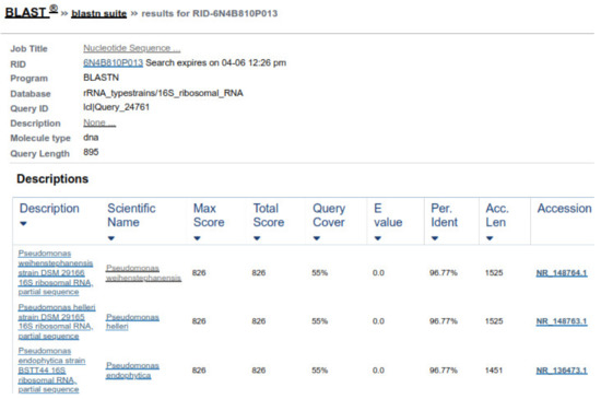 Two forward and two reverse sequences for each sample were aligned using Bionumerics v3.5 (Applied Maths) to obtain a composite sequence. The quality of each sequence trace was visually assessed, and the poor-quality sequence was edited and removed. Organisms were identified for each assay, by comparing consensus sequences to a database library of known 16S rRNA gene sequences in GenBank (http://www.ncbi.nlm.nih.gov/blast/Blast.cgi, accessed on 3 April 2021) by multiple sequence alignment. The bacterial source of the sequence was identified by matching it with a sequence with the highest maximum identity score from the GenBank database. Where more than one bacterial species had the same highest score, all species were recorded in the results (Figure 8 and Figure 9). Sequences with 96% similarity to hits from the GenBank database were of poor quality and were excluded from this study (Figure 10).