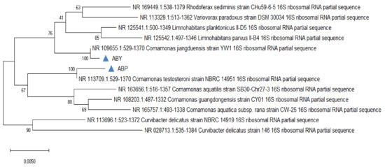 The phylogenetic tree was constructed on the origin of 16S rRNA gene sequences for the bacterial isolates using MEGA 6 software. Phylogenetic analysis showed (Figure 11) that ABP was identified as Comamonas testosteroni and ABY Comamonas jiangduensis.