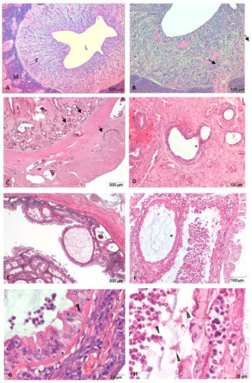 Histologically, multifocal cystic endometrial hyperplasia, lymphocytes and neutrophil migration into the lumen of endometrial glands was detected. In all uteri, there was extensive purulent inflammation of the endometrium, which was usually diffuse or multifocal. Moreover, in several cases, we identified interstitial fibrosis of the endometrium, adenomyosis and endometrial hemorrhage in the tissue section (Figure 1E,F).