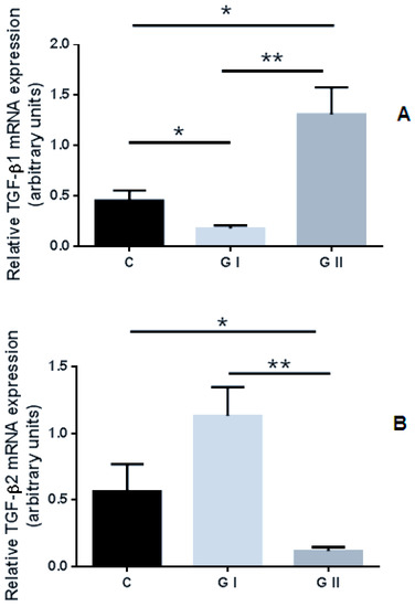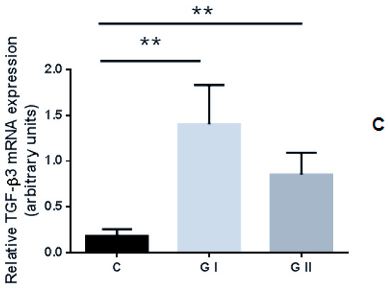 Relative expression of (A) TGF-β1, (B) TGF-β2, and (C) TGF-β3 in canine endometrium with various proliferative and degenerative changes: cystic endometrial hyperplasia (GI) and CEH–pyometra (GII) compared to the standard physiological endometrium (C, control group). The data were normalized by dividing the expression of target genes by the expression of the housekeeping gene (GAPDH). All treatments were performed in triplicates and bars represent the mean ± SEM. The asterisks indicate significant differences as follows: *, p < 0.05; **, p < 0.01.
