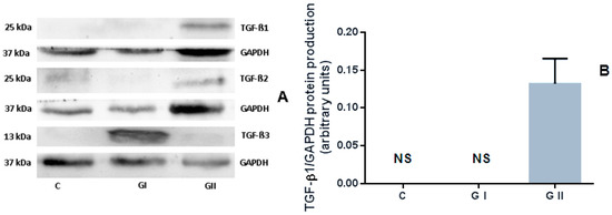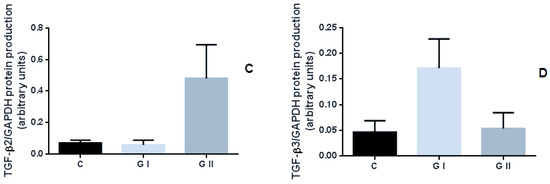 TGF-β1 (B), TGF-β2 (C), and TGF-β3 (D) protein production in bitches’ endometrium samples with cystic endometrial hyperplasia (GI) and pyometra (GII) compared to the physiological endometrium (C, control group). (A) Representative blots for TGF-β and GAPDH. The data were normalized to glyceraldehyde-3-phosphate dehydrogenase (GAPDH). The bars represent the mean ± SEM, in arbitrary units. The TGF-β1 (B) and TGF-β2 (C) signals were identified as mature dimers (25 kDA); for the TGF-β3 (D) signal, mature monomer (13 kDA) was detected. NS, no protein signal.