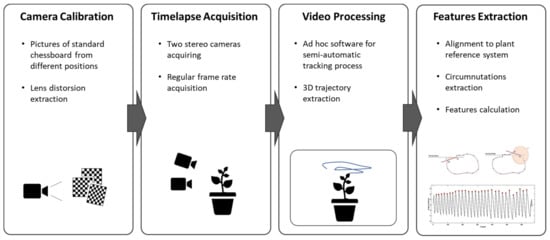 The solution proposed in this paper is based on the acquisition and analysis of the plant’s movement through a stereovision system that generates time-lapses of the plant and reconstructs its 3D movement. The system workflow (Figure 1) envisages the acquisition of temporally equally spaced images of the plant by two fixed calibrated cameras. A semi-automatic point tracking process is applied to reconstruct the 3D trajectory of custom landmarks over the entire acquisition. Finally, the descriptive features of the 3D movement of the plant are computed from the analysis of the trajectories. The following sections illustrate the process details. The system has been extensively used for a specific experimental setup designed to investigate circumnutation pattern of climbing peas (Pisum sativum L. var. saccharatum cv Carouby de Maussane; hereafter P. sativum)