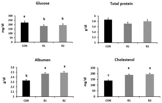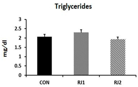The administration of RJ significantly decreased the serum glucose, but increased the levels of serum albumen and cholesterol (Figure 1). On the contrary, the RJ treatment did not affect the levels of serum total proteins and triglycerides.