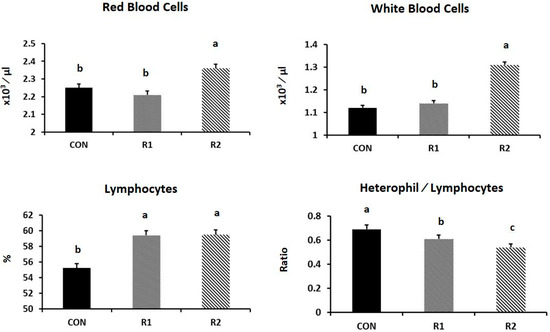 The R1 group exhibited greater erythrocyte and total leucocyte counts (p = 0.031 and 0.001, respectively). Furthermore, the RJ treatment significantly increased the lymphocyte % (p = 0.004), but significantly reduced the H/L ratio (p = 0.001) (see Figure 2).