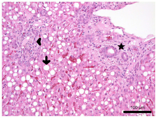 Gross necropsy examination of lamb 1 (sample ID 1) revealed crusty and ulcerated skin over the nasal planum (region nasalis), ears and distal parts of the skin of all four limbs. The liver was friable with yellow discolouration. The remaining gross organ examination was unremarkable. Microscopical examination of the skin revealed a severe pustular to ulcerative dermatitis with orthokeratotic hyperkeratosis, multifocal epidermal hyperplasia and a mild multifocal histiocytic to suppurative infiltration. Hepatocytes showed severe accumulation of micro- and macrovesicular fat droplets with single-cell necrosis (fatty degeneration). Mild biliary hyperplasia with cholestasis and a mild periportal lymphocytic and histiocytic infiltration were also noted (Figure 1).