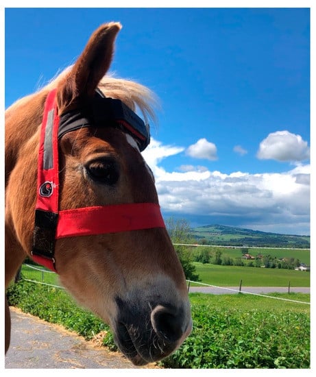 The wearable horse unit of the automated equine monitoring system (Hoofstep®) is attached to the horses’ forehead using a special flexible softshell head collar.
