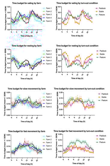 Time budgets for eating, resting, slow movement (“active”) and fast movement (“highly active”) by farm (left) and by turn-out condition (right) detailed by time of day.