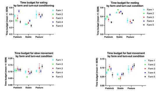As for linear models, causality needs to be assumed, the horse’s identity, housing (as factor), sex (gelding/mare), age, lameness (yes/no), and season were treated as explanatory variables. For an initial overall analysis of the mean time budget (Analysis of covariance, ANCOVA), target variables were mean activity time budgets per 24 h. These calculations were performed with the “R” statistical programming language (R Foundation for Statistical Computing, Vienna, Austria https://www.R-project.org/) [39]. In more detailed analyses of the daily time budgets, the effects of farm, turn-out condition, health/age group, and time of day were considered fixed effects in a series of multifactorial ANOVAs using NCSS 2020 Statistical Software (NCSS, LLC. Kaysville, UT, USA, ncss.com/software/ncss) and Graphpad Prism 9 (GraphPad Software, LLC. San Diego, CA, USA).