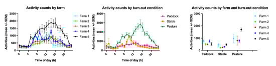 Activity counts by farm and turn-out condition detailed by time of day and by farm x turn-out condition.