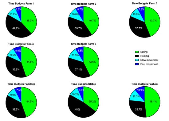Pie charts illustrating the distribution of the time budgets by farm and turn-out condition.