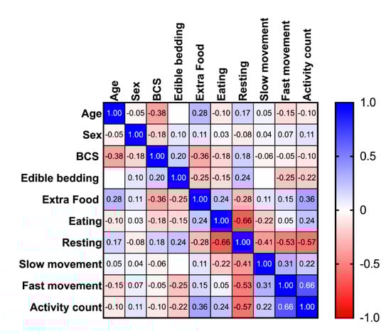 Heatmap of the Spearman correlation matrix for age, sex, body condition score (BCS), edible bedding, extra food, the time budget for eating, resting, slow movement and fast movement and the activity count.