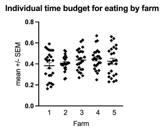 The scatter plot shows the individual mean time budget for eating for all horses included in this study divided by farm. For each farm, the mean ± SEM is indicated. The time budget for eating is similar for most horses except for a few outliers, which might be an indication for potential health or welfare issues.