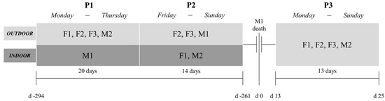 - Wooddell, L.J.; Kaburu, S.S.K.; Rosenberg, K.L.; Meyer, J.S.; Suomi, S.J.; Dettmer, A.M. Matrilineal behavioral and physiological changes following the death of a non-alpha matriarch in rhesus macaques (Macaca mulatta). PLoS ONE 2016, 11, e0157108. [Google Scholar] [CrossRef][Green Version]