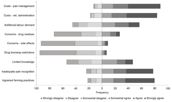 Respondents were given the opportunity to elaborate on additional barriers to the provision of pain management that were not included in the scale. Of the 16 qualitative responses, the most representative considerations included concerns for how restricted veterinary medicine (RVM) may limit the use of pain management on-farm, with lay contractors requiring “a system/authorisation to access and use RVM”. Further concerns included a “lack of understanding of the benefits of pain relief beyond just welfare”, a “lack of empathy”, and “disorganisation” on-farm. Respondents were also concerned with the normalisation of procedures without pain mitigation due to the accessibility of lay contractors “with apparent expertise advertising services without pain relief, which legitimises the practice”.