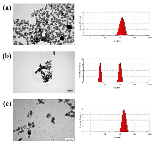 TEM images and size distribution (hydrodynamic diameter) of nanoparticles: (a) silver nanoparticles; (b) copper nanoparticles; (c) silver–copper complex.