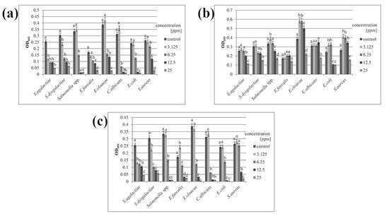 Minimal inhibitory concentration (MIC) was determined using serial dilution based on the concentration at which 50% of the bacterial growth was inhibited, which is considered one of the basic parameters for evaluating the effectiveness of tested substances [25]. Both AgNPs and the Ag-Cu complex could inhibit microbial growth at a relatively low concentration (Table 2). Optical density measurements showed that the minimal inhibitory concentration reduced microbial growth by approximately half (Figure 2). In the case of CuNPs, a concentration four times higher (25 ppm) was needed to limit the growth of most species. Salmonella spp. and E. coli were more sensitive, and the inhibitory concentration of CuNPs for these species was twice that of AgNPs and Ag-Cu complex (12.5 ppm for CuNPs and 6.25 ppm for the others).