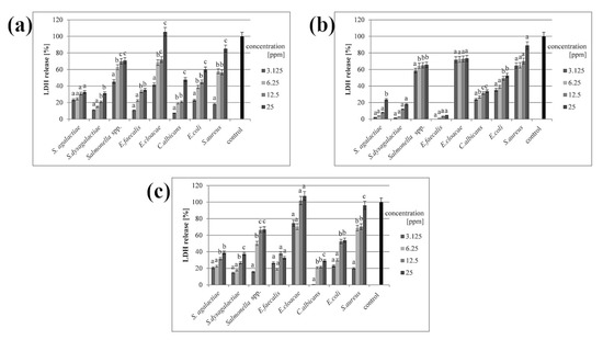 To evaluate cell membrane integrity, the lactate dehydrogenase (LDH) activity was examined using a Cytotoxicity Detection Kit (In Vitro Toxicology Assay Kit, based on lactic dehydrogenase, LDH, Sigma-Aldrich, Hamburg, Germany). 100 μL of bacteria and yeast cells (1 × 106 CFU/mL) were cultured in liquid medium (MH for bacteria and YNB for yeast) on 96-well plates, with the addition of nanoparticles in the concentrations identified as the minimal inhibitory concentration for microbial species used (3.125, 6.25, 12.5, 25 ppm). After 24 h of incubation, 100 μL of the LDH assay mixture was added to each well. The plates were kept in the dark and incubated for 30 min at room temperature (25 °C). The absorbance was recorded at 490 nm on an ELISA reader (Infinite M200, Tecan, Männedorf, Switzerland). LDH leakage was expressed as a percentage of the test sample (reduced by the value of the blank) in relation to the control sample (also reduced by the value of the blank), where a blank probe was the medium without cells, and the control sample was inoculum treated with 100 μL of Triton X-100 (Sigma-Aldrich, Hamburg, Germany).
