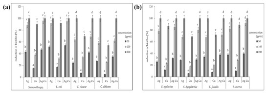Both AgNPs and CuNPs have great potential as antibacterials for inhibiting microbial growth [26]. The combination of AgNPs and CuNPs results in a synergy of effects, even though the activity of separate nanoparticles (Ag or Cu) is distinct. This means that the Ag-Cu complex is more promising than either nanoparticle used alone [27]. A similar effect has been observed in an earlier study on mastitis pathogens, where AgNPs and CuNPs caused a high degree of disruption to microbial viability [28]. We also found that the Ag-Cu complex caused the greatest biofilm reduction (Figure 4). In all samples, even the lowest concentration of the complex (50 ppm) disrupted biofilm growth more than either individual component. In all samples, higher nanomaterial concentration caused greater biofilm reduction. Interestingly, this was true not only for every nanomaterial but also for every microorganism species (Figure 4).