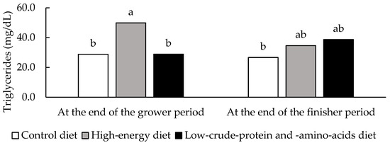 A significant interaction (p = 0.031) between diet and sampling time on serum triglyceride concentration is shown in Figure 1. At the end of the grower period, gilts fed the high-energy diet showed higher triglyceride levels than those in the other two groups. However, at the end of the finisher period, that effect was mitigated and no difference was found among the three experimental diets, confirming the lack of significance detected on carcass fatness. Kim et al. [40], in lighter pigs, did not observe differences between diets with different energy contents. As in the current trial, Suárez-Belloch et al. [29] also found no influence of CP and AA restriction on triglyceride levels. However, in other report, Suárez-Belloch et al. [43] detected that the reduction of CP and AA contents promoted a linear increase of triglycerides at the end of the grower phase.