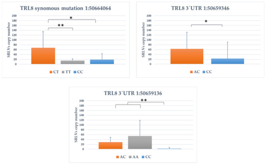 Figure 2. The association between genotype within TLR8 genes and SRLVs copy number. *: p < 0.05; **: p < 0.01.