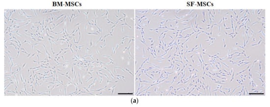 Trilineage (osteoblast, adipocyte, and chondrocyte) differentiation was conducted using BM-MSCs and SF-MSCs as previously described []. For osteogenic differentiation, cells were cultured for a total of 21 days in a DMEM media supplemented with 10% FBS 10 nM dexamethasone, 50 μg/mL ascorbic acid, and 10 mM sodium beta-glycerophosphate. After differentiation, mineralization and calcium deposition were affirmed using Alizarin red S and von Kossa staining. Adipogenic differentiation of cultured MSCs was conducted in DMEM supplemented with10% FBS, 100 µM indomethacin, 10 µM insulin, and 1 µM dexamethasone. Differentiation into chondrocytes was accomplished utilizing a modified pellet culture method. Pellets were made in 15 mL centrifuge tubes with 1 mL cellular suspension of passage 3 cells (1 × 106) in STEMPRO chondrogenesis differentiation media with 10% supplement in a 15 mL tube. Centrifugation was performed at 450× g for 5 min and the resultant pellets were cultured for 3 weeks. Afterward, culture pellets were embedded in paraffin and sectioned on glass slides following dehydration. A 1% Alcian blue solubilized in 3% acetic acid was used for staining for a period of 10 min with proteoglycan deposition confirmed with a 1 min counterstaining using a 0.1% solution of nuclear fast.