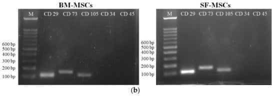 Establishment of BM-MSCs and SF-MSCs. (a) Cellular morphology of BM-MSCs and SF-MSCs from camel. Both MSCs showed a spindle-like morphology at passage 3. Scale bar = 100 µm. (b) Agarose gel electrophoresis of PCR products. Both BM-MSCs and SF-MSCs were positive for the mesenchymal stem cell markers (CD29, CD72, and CD105) and were negative for the hematopoietic stem cell markers (CD34 and CD45). Lane M: 100 bp DNA ladder.