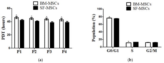 Cell cycle and proliferation capacity of bone marrow (BM-MSCs) and synovial fluid (SF-MSCs) from the camel. (a) The proliferation capacity was evaluated by population doubling time (PDT) assay. SF-MSCs showed increased proliferation capacity compared to BM-MSCs during the passage. (b) Cell cycle analysis indicated that cell arrest and DNA replication were significantly increased in SF-MSCs compared to BM-MSCs. Bar graphs illustrate mean values +/− SD (n = 4). * denote significant (p < 0.05) differences (P1, P2, P3, and P4: passage 1, 2, 3, and 4; G0/G1: G0/G1 phase; S: S phase; G2/M: G2/M phase).