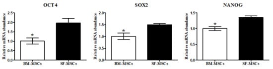 Stem cell transcription factor expression of BM- and SF-MSCs. SF-MSCs when related to BM-MSCs exhibited increased expression for all three transcription factors. * denote significant differences (p < 0.05). Bar graphs illustrate mean values +/− SD (n = 4).