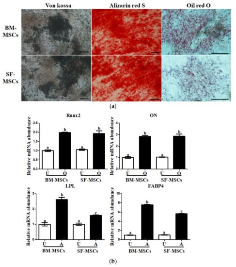 In vitro differentiation into osteoblast and adipocyte from BM- and SF- derived MSCs. (a) The osteoblast differentiation of both MSCs was confirmed by staining of calcium deposition and mineralization with von Kossa and Alizarin red S (Scale bar = 100 µm). (b) Osteoblast (Runx2 and ON) and adipocyte (LPL and FABP4) related gene expression in induced cells. All adipocyte-related genes were significantly increased in differentiated cells from BM-MSCs compared to those from SF-MSCs. However, there was no difference in the expression of osteoblast-related genes between the BM- and SF-MSCs. Graphs represent mean data ± SD from independent experiments (n = 4). Different superscripts (a, b, and c) denote significant differences (p < 0.05) among the undifferentiated control and differentiated cells using BM-MSCs and SF-MSCs (white bar: undifferentiated cells; black bar: differentiated cells; U: undifferentiated cells; O: osteogenic differentiated cells; A: adipogenic differentiated cells).