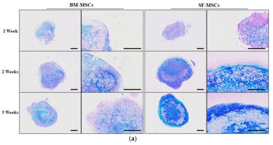 Differentiation of BM- and SF-MSCs into chondrocytes succeeded using the pellet culture method. The accumulation of proteoglycan was observed both in pellets from BM- and SF-MSCs after 1 week by Alcian blue staining (Figure 5a). Following the differentiation process, these cells grew and the multi-layered structure was confirmed in the chondrogenic pellet. Some portion of the pellet showed hypertrophic chondrocyte formation after 2 to 3 weeks on chondrocyte differentiation using SF-MSCs (Figure 5a). The expression levels of type X collagen gene (COL10A1), aggrecan (ACAN), and the alpha 1 chain of collagen type II (COL2A1) were investigated following three weeks of the chondrogenesis procedure (Figure 5b). In BM-MSCs, the levels of chondrocyte-specific gene expressions were significantly higher in differentiated chondrocytes at 1 to 3 weeks compared to undifferentiated cells (Figure 5b). There was a more significant expression in all chondrocyte-specific markers analyzed in differentiated cells following the chondrogenesis protocol in SF- compared to BM-MSCs. The levels of ACAN gradually increased as the chondrogenesis from SF-MSCs. In the process of differentiation of BM-MSCs into chondrocytes, COL10A1, ACAN, and COL2A1 expression were not significantly different. The deposition of glycosaminoglycan (GAG) was increased in chondrogenic pellets related to undifferentiated pellets (Figure 6). Furthermore, after two weeks of differentiation into chondrocytes, SF-MSCs showed increased GAG deposition compared to BM-MSCs (Figure 6).