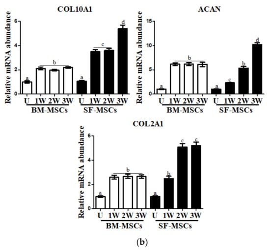 In vitro chondrocyte differentiation capacity by time of BM- and SF-MSCs. Chondrogenesis was evaluated by cytochemical staining and RT-qPCR analysis. (a) In vitro chondrocyte differentiation was demonstrated by Alcian blue staining in induced pellets one, two, and three weeks after induction. Scale bar = 500 µm. (b) Genes (COL10A1, ACAN, and COL2A1) expressed in chondrocytes, in induced BM- and SF-MSCs one, two, and three weeks after induction. At three weeks following chondrogenesis, all chondrocyte-specific markers were significantly increased in chondrocyte pellets in SF- versus BM-MSCs. Values displayed as mean and ± SD, independent experiments (n = 4). Different superscripts (a, b, c, and d) denote significant differences (p < 0.05) among undifferentiated cells, and 1, 2, and 3 weeks of differentiated cells using BM-MSCs and SF-MSCs (white bar: undifferentiated cells; black bar: differentiated cells U: undifferentiated cells; 1W: one week after chondrocyte induction; 2W: two weeks after chondrocyte induction; 3W: three weeks after chondrocyte induction).