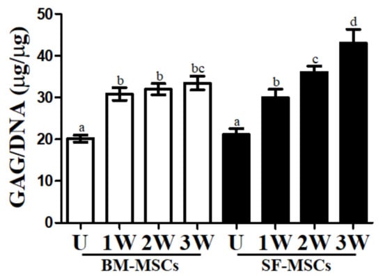 The values of glycosaminoglycan (GAG) content of BM- and SF-MSCs was evaluated one, two, and three weeks after induction. The GAG contents were significantly higher in groups following differentiation in SF compared to BM-MSCs after three weeks of differentiation. Values displayed are mean ± SD independent experiments (n = 4). Different superscripts (a, b, c, and d) denote significant differences (p < 0.05) among undifferentiated cells, and 1, 2, and 3 weeks of differentiated cells using BM-MSCs and SF-MSCs (white bar: undifferentiated cells; black bar: differentiated cells U: undifferentiated cells; 1W: one week after chondrocyte induction; 2W: two weeks after chondrocyte induction; 3W: three weeks after chondrocyte induction).