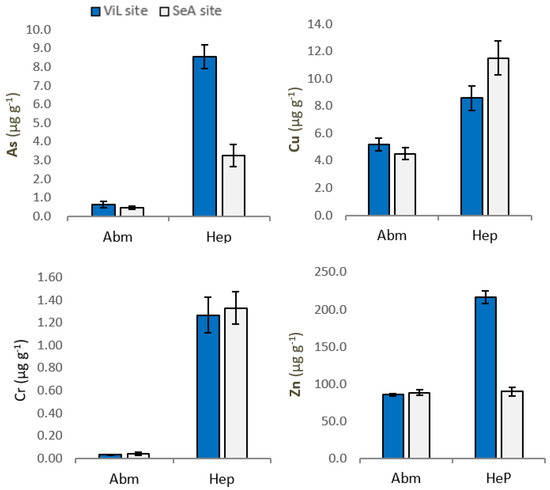 The general evidence was that crayfishes from ViL and SeA accumulated higher levels of metals (As, Cu, Zn and Cr) in Hep than in AbM, in accordance with those reported in literature [7,14,15,16]. Almost all studies on the distribution of trace elements in crayfish tissues showed that the hepatopancreas is the target organ of storage and detoxification of heavy metals [7,8,9,10]. However, in the present study, no statistical differences were reported for Cd and Pb concentrations in AbM and Hep of P. clarkii, probably due to the negligible concentrations of these non-essential trace elements in the aquatic environment of both sampling sites.