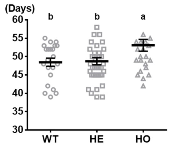 Comparison of first egg laying dates of wild-type (WT), MSTN heterozygous mutant quail (HE) and MSTN homozygous mutant quail (HO). Values present means ± SEM. n = 22 WT females, 40 HE females, and 25 HO females. One-way ANOVA was used for statistical analysis by the GraphPad PRISM. a,b Means that have no superscript in common in a graph are different (p < 0.05).