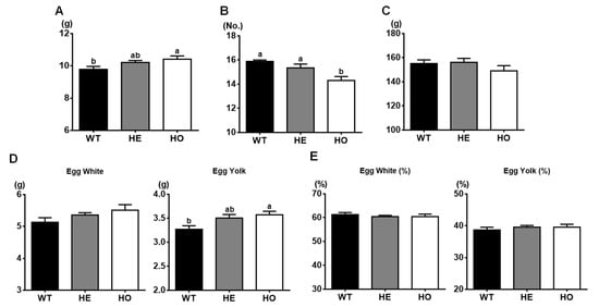 Comparisons of egg quality and quantity traits of WT, HE, and HO female quail from 90 to 110 days of age. (A) Egg weights. (B) Egg numbers. (C) Total egg production. (D) Weights of egg whites and yolks. (E) Percentage proportions of egg whites and yolks in egg weights. Values present means ± SEM. n = 9 WT females, 9 HE females, and 10 HO females. One-way ANOVA was used for statistical analysis by the GraphPad PRISM. a,b Means that have no superscript in common in a graph are different (p < 0.05). No.: Number of eggs.