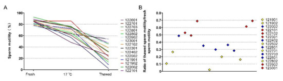 Screening semen for differential freezability. (A) sperm motility during freezing and after thawed, (B) relative sperm motility, ratio of thawed sperm motility/fresh sperm motility.