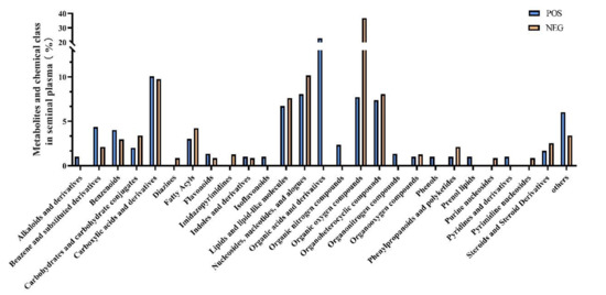 A total of 953 metabolites were identified after UHPLC-qTOF-MS analysis of these seminal plasma samples, regardless of group. Metabolites were identified and categorized according to their major chemical classes, including carboxylic acids and derivatives, organooxygen compounds, amino acids, peptides, analogues, fatty amides, fatty acyls, benzene and substituted derivatives, purine nucleotides, pyrimidine nucleotides, glycosyl compounds, fatty acids, and conjugates (Figure 2). A total of 534 (POS, 298; NEG, 236) features could be mapped to current databases. According to the classification of metabolites, it was found that in the POS mode the main metabolites were organic acids and their derivatives, which contains 68 metabolites, accounting for 24% of all metabolites detected. The remaining metabolites were carboxylic acids and their derivatives (10%); nucleosides, nucleotides, and analogues ranked third (8%); followed by the organic oxygen compounds, organoheterocyclic compounds, lipids and lipid-like molecules, benzene and its substituted derivatives, benzenoids, and the other 14 metabolites (Figure 2). In the NEG mode, 87 kinds of organic oxygen compound metabolites were detected, accounting for 37% of all metabolites detected, followed by nucleosides, nucleotides, and analogues (10%), carboxylic acids and their derivatives (10%) ranked third, followed by organoheterocyclic compounds (8%), lipids and lipid-like molecules (8%), fatty acyls (4%), and 12 other metabolites (Figure 2).