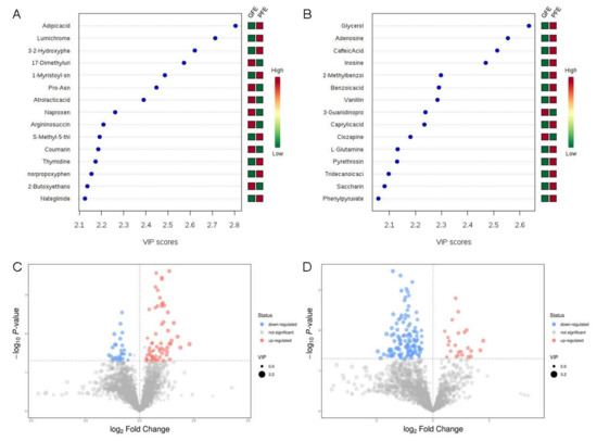 Based on the analysis of the OPLS-DA method, the calculated VIP and p value is shown in Figure 3. According to the OPLS-DA and volcano plot, metabolites with a VIP score greater than 1 and a p-value less than 0.05 were identified and considered as candidate freezability markers. The cluster analysis of each candidate metabolite is shown in Figure 4A,B. Finally, a total of 50 metabolites showed significant differences between the GFE and PFE groups (Tables S2 and S3).