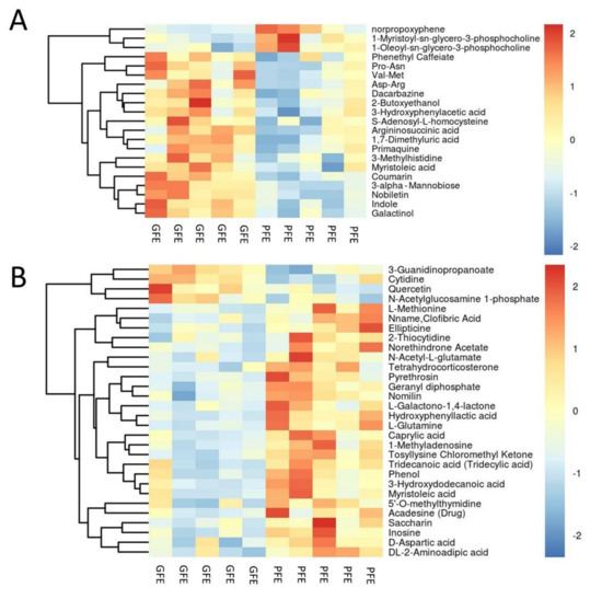 Heat map of metabolites with different content between the GFE and PFE groups. (A,B) was analyzed in positive and negative ions mode, respectively.
