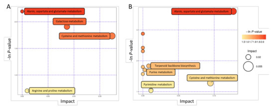 We analyzed the differential metabolic pathways via KEGG analysis (Table S4). These differential metabolites were mainly enriched in amino acid biosynthetic metabolic pathways such as alanine, aspartic acid, glutamic acid, arginine, proline, cysteine, and methionine biosynthetic metabolic pathways. Some of the metabolites are enriched in purine metabolism, pyrimidine metabolism, terpenoid backbone biosynthesis, aminoacyl tRNA biosynthesis, and other metabolic pathways (Figure 5A,B).