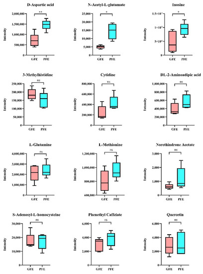 Among the 50 candidate metabolites obtained from the above analysis, 3-methylhistidine (p = 0.036), phenethyl caffeate (p = 0.049), S-adenosyl-L-homocysteine (p = 0.049), D-aspartic acid (p = 0.031), L-methionine (p = 0.018), DL-2-aminoadipic acid (p = 0.014), L-glutamine (p = 0.009), N-acetyl-L-glutamate (NAG) (p = 0.009), cytidine (p = 0.023), inosine (p = 0.012), quercetin (p = 0.034), and norethindrone acetate (p = 0.024) were chosen and further verified by targeted metabolism. The result reveals that D-aspartic acid, NAG, and inosine showed significant differences between GFE and PFE (p < 0.05) (Figure 6).