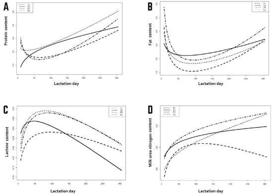 Presents the results for other milk traits in herds with different feeding management systems. Curves for protein (A), fat (B), lactose (C), milk urea (D) contents Herds: T1—one TMR (total mixed ration).throughout lactation; P1—one PMR (partial mixed ration) throughout lactation; T2 and T3—three feeding periods: FRESH, TMR I and TMR II, according to days in milk (kg).