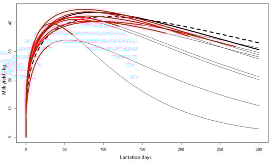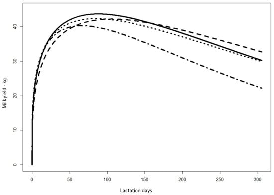 The milk yield for the period of 0–305 days of milking was calculated for the curves from Figure 4. These values are similar and range from 11,348.95 to 11,614.94.