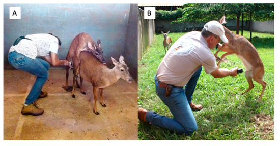The use of an artificial vagina (AV) is considered a good technique because the ejaculate presents a quality similar to coitus, reducing the animal’s stress and the need for constant collection [70]. The difficulty in this technique is to previously train the animals to become accustomed to the operator and handling [71]. In attempts at the seminal collection with AV in M. americana, it was found that males with low sexual interest were assaulted by females in more than 50% of the collection sessions. Thus, for the success of the technique, it is expected that the greater the libido of the males, the greater the probability of success in obtaining ejaculates [72]. Using females in estrus as a live mannequin, it was possible to perform the lateral deviation of the penis towards AV, and to obtain the seminal collection in individuals of the genus Mazama (Figure 1A). The success rates vary in the literature, from 75% to 100% in M. gouazoubira [72] and from 50% to 70% in M. americana [72,73]. It is also possible to use imprinted animals for seminal collections by AV, where the males perform the mounts directly on the operator’s knee (Figure 1B). This type of collection has already been described in O. bezoarticus [74]. In addition, it has also been observed in M. gouazoubira [75].